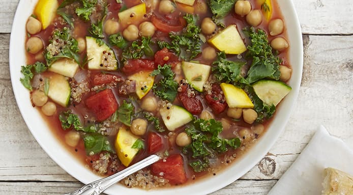 Looking for a new vegan soup recipe? Try this amazing and comforting soup with kale, zucchini, chickpeas, served with quinoa.