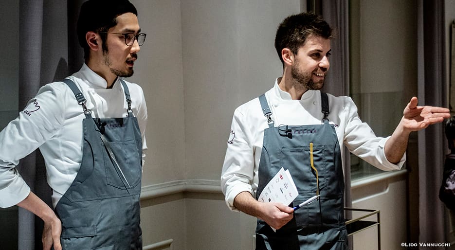 Chef Lorenzo Cogo of Michelin starred El Coq in Vincenza, Italy hosted Japanese chef Yasuhiro Fujio, ex sous chef of two Michelin starred La Cime di Osaka and winner of 2018 S.Pellegrino Young Chef international contest in a unique event.
